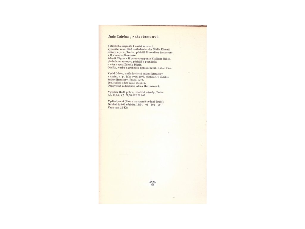 edice Klub čtenářů, plátěná vazba, přebal chybí, jinak dobrý stav, obsahuje Neexistující rytíř, Rozpůlený vikomt, Baron na stromě, překlad Zdeněk Digrin a Vladimír Mikeš, 374 stranDoplňkové parametry