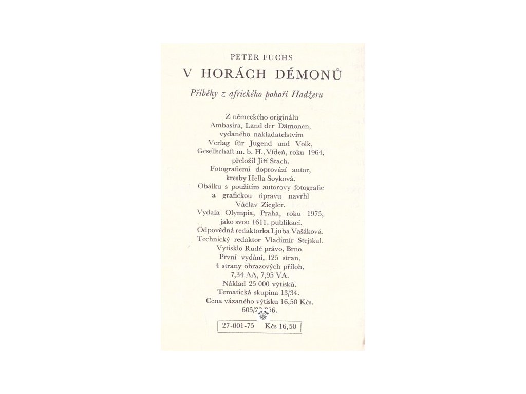 příběhy z afrického pohoří Hadžer, překlad Jiří Stach, plátěná vazba, přebal chybí, doplněno fotografiemi, dobrý stav, 125 stran, 4 strany obrazové přílohyDoplňkové parametry
