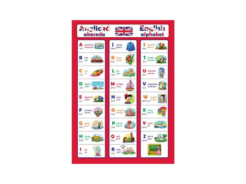Naučte se anglickou abecedu, ke každému slovíčku najdete vhodné slovo z anglického jazyka, začínající daným písmenem. Z druhé strany pak najdete základní barvy! Tato kartička je vhodná pro každého začínajícího angličtináře.Doplňkové parametry