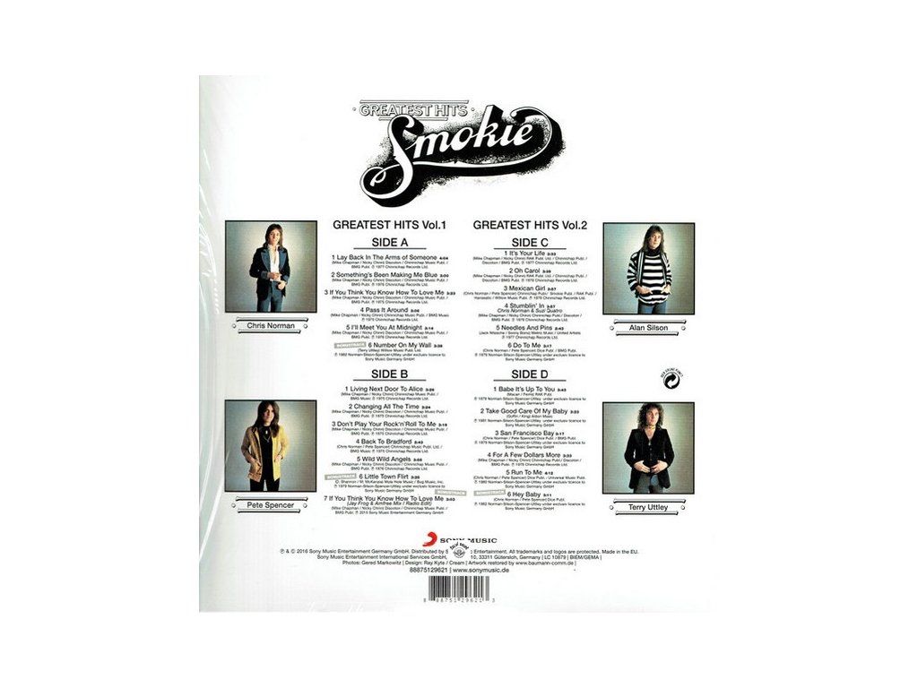 greatest hits 1 + 2 dohromady, white vinyl, gatefold, 4x bonus track, track list: A1 Lay Back In The Arms Of Someone 4:04 / A2 Something's Been Making Me Blue 3:00 / A3If You Think You Know How To Love Me 3:23 / A4 Pass It Around 3:06 / A5 I'll Meet You At Midnight 3:14 / A6 Number On My Wall 3:38 /// B1 Living Next Door To Alice 3:26 / B2 Changing All The Time 3:24 / B3 Don't Play Your Rock'n'Roll To Me 3:19 / B4 Back To Bradford 2:43 / B5 Wild Wild Angels 3:55 / B6 Little Town Flirt 3:25 / B7 If You Think You Know How To Love Me (Jay Frog & Amfree Mix / Radio Edit) 3:03 /// C1 It's Your Life 3:33 / C2 Oh Carol 3:39 / C3 Mexican Girl 3:57 / C4 Stumblin' In 3:57 / C5 Needles And Pins 2:43 / C6 Do To Me 3:17 /// D1 Babe It's Up To You 3:43 / D2 Take Good Care Of My Baby 3:23 / D3 San Francisco Bay 3:17 / D4 For A Few Dollars More 3:33 / D5 Run To Me 4:12 / D6 Hey Baby 3:11Buďte první, kdo napíše příspěvek k této položce.