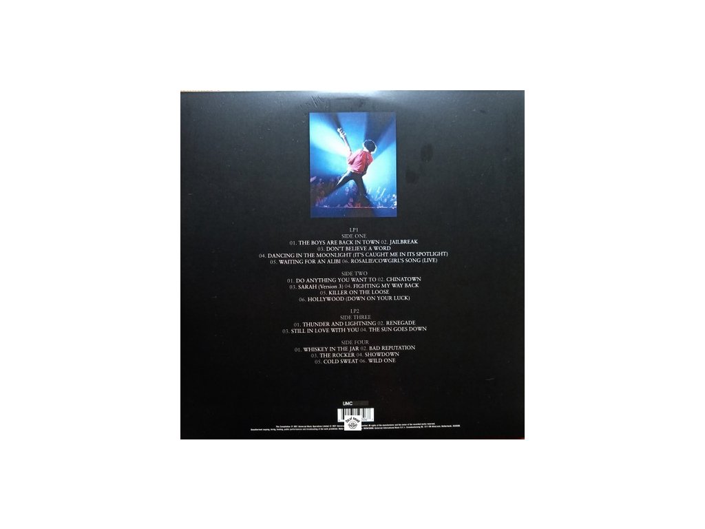 embosovaný gatefold (jako že nápis Thin Lizzy je plastický :)), vnitřní přebaly s foty a info, dowload code, track list: A1 The Boys Are Back In Town / A2 Jailbreak / A3 Don’t Believe A Word / A4 Dancing In The Moonlight (It’s Caught Me In Its Spotlight) / A5 Waiting For An Alibi / A6 Rosalie (Live) /// B1 Do Anything You Want To / B2 Chinatown / B3 Sarah (Version 3) / B4 Fighting My Way Back / B5 Killer On The Loose / B6 Hollywood (Down On Your Luck) /// C1 Thunder And Lightning / C2 Renegade / C3 Still In Love With You / C4 The Sun Goes Down /// D1 Whiskey In The Jar / D2 Bad Reputation / D3 The Rocker / D4 Showdown / D5 Cold Sweat / D6 Wild OneDoplňkové parametry