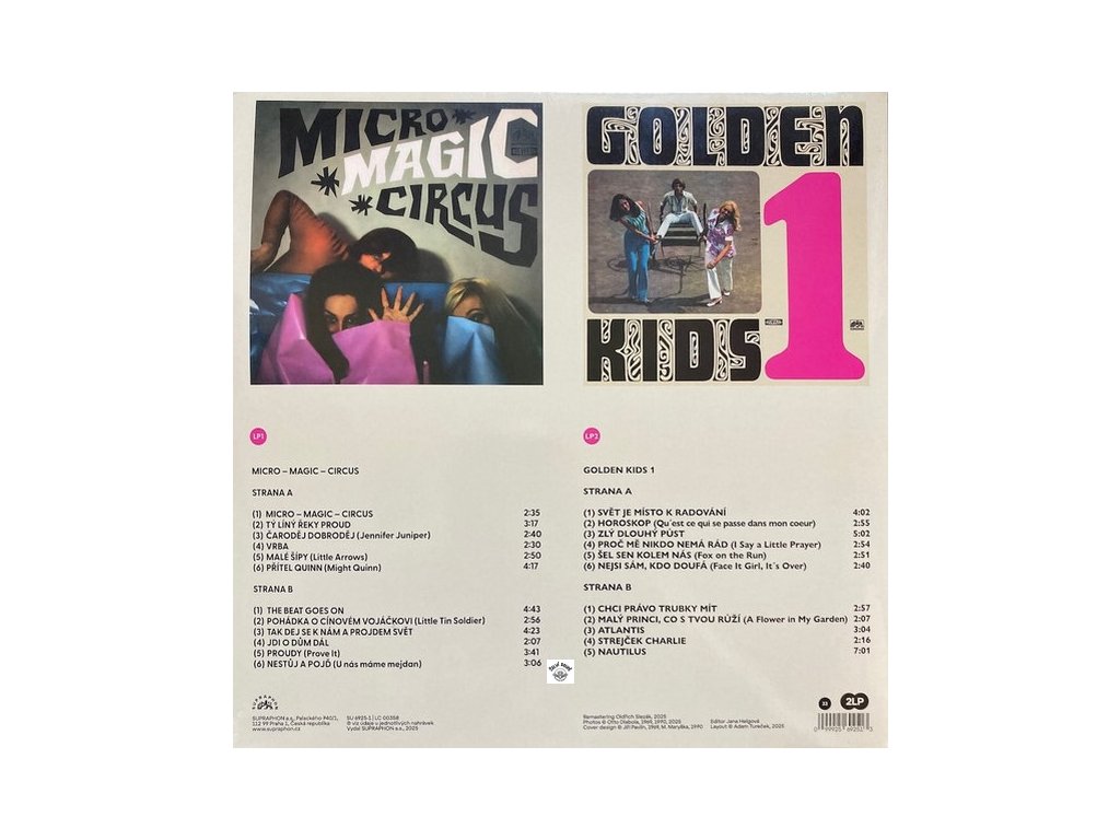 gatefold, remaster, vnitřní přebaly jako replika pův. přebalů s info, příloha, track list: Micro-Magic-Circus: A1 Micro-Magic-Circus 2:35 / A2 Tý líný řeky proud 3:17 / A3 Čaroděj Dobroděj (Jennifer Juniper) 2:40 / A4 Vrba 2:30 / A5 Malé šípy (Little Arrows) 2:50 / A6 Přítel Quinn (Might Quinn) 4:17 /// B1 The Beat Goes On 4:43 / B2 Pohádka o cínovém vojáčkovi (Little Tin Soldier) 2:56 / B3 Tak dej se k nám a projdem svět 4:23 / B4 Jdi o dům dál 2:07 / B5 Proudy (Prove It) 3:41 / B6 Nestůj a pojď (u nás máme mejdan) 3:06 //// Golden Kids 1: C1 Svět je místo k radování 4:02 / C2 Horoskop (Qu'est Ce Qui Se Passe Dans Mon Coeur) 2:55 / C3 Zlý dlouhý půst 5:02 / C4 Proč mě nikdo nemá rád (I Say A Little Prayer) 2:54 / C5 Šel sen kolem nás (Fox On The Run) 2:51 / C6 Nejsi sám, kdo doufá (Face It Girl, It's Over) 2:40 /// D1 Chci právo trubky mít 2:57 / D2 Malý princi, co s tvou růží (A Flower In My Garden) 2:07 / D3 Atlantis 3:04 / D4 Strejček Charlie 2:16 / D5 Nautilus 7:01Doplňkové parametry
