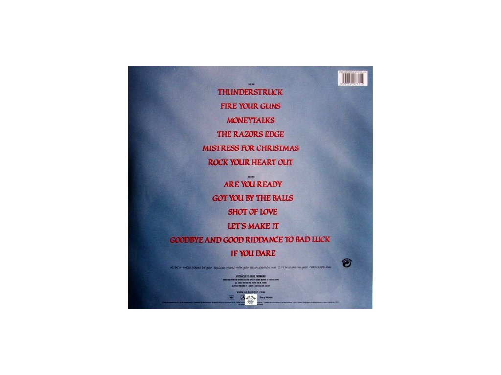 přebal uvádí vydání 2003, ale je to 2018, 180gr heavy weight vinyl, remastered, vnitřní přebal s foty a info, track list:A1 Thunderstruck 4:52 / A2 Fire Your Guns 2:53 / A3 Moneytalks 3:45 / A4 The Razors Edge 4:22 / A5 Mistress For Christmas 3:58 / A6 Rock Your Heart Out 4:06 /// B1 Are You Ready 4:10 / B2 Got You By The Balls 4:29 / B3 Shot Of Love 3:57 / B4 Let´s Make It 3:32 / B5 Goodbye And Good Riddance To Bad Luck 3:14 / B6 If You Dare 3:11Buďte první, kdo napíše příspěvek k této položce.