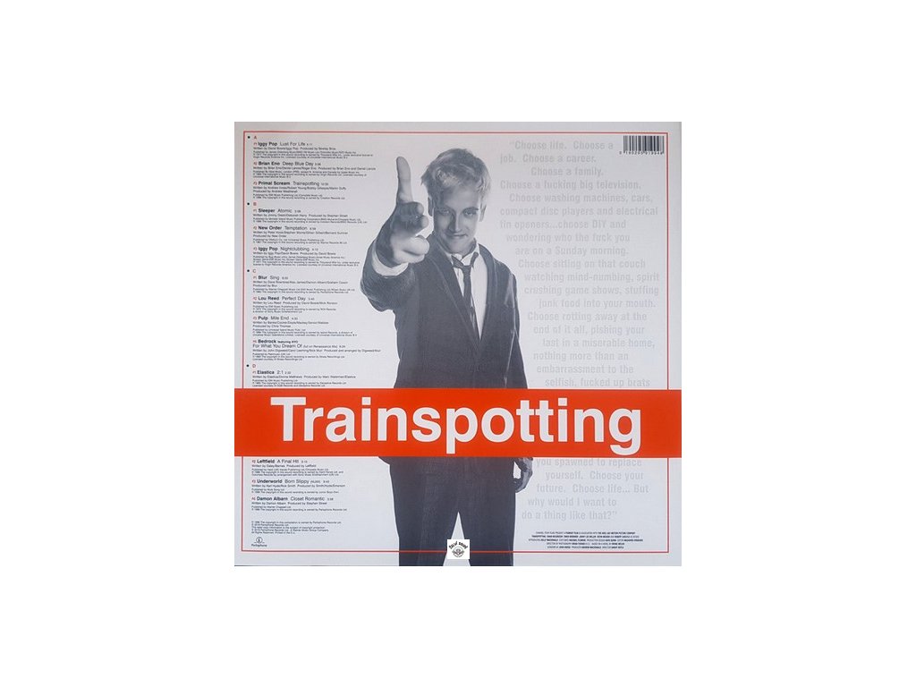 20th anniversary edition, 2xLP v jednoduchém přebalu, 180gr heavy weight vinyly, track list: A1 Iggy Pop - Lust For Life 5:11 / A2 Brian Eno - Deep Blue Day 3:56 / A3 Primal Scream - Trainspotting 10:33 /// B1 Sleeper - Atomic 5:08 / B2 New Order - Temptation 6:59 / B3 Iggy Pop - Nightclubbing 4:12 /// C1 Blur - Sing 6:00 / C2 Lou Reed - Perfect Day 3:43 / C3 Pulp - Mile End 4:30 / C4 Bedrock Featuring KYO - For What You Dream Of (Full On Renaissance Mix) Featuring - KYO 6:24 /// D1 Elastica - 2:1 2:32 / D2 Leftfield - A Final Hit 3:15 / D3 Underworld - Born Slippy (NUXX) 9:43 / D4 Damon Albarn - Closet Romantic 3:08Buďte první, kdo napíše příspěvek k této položce.