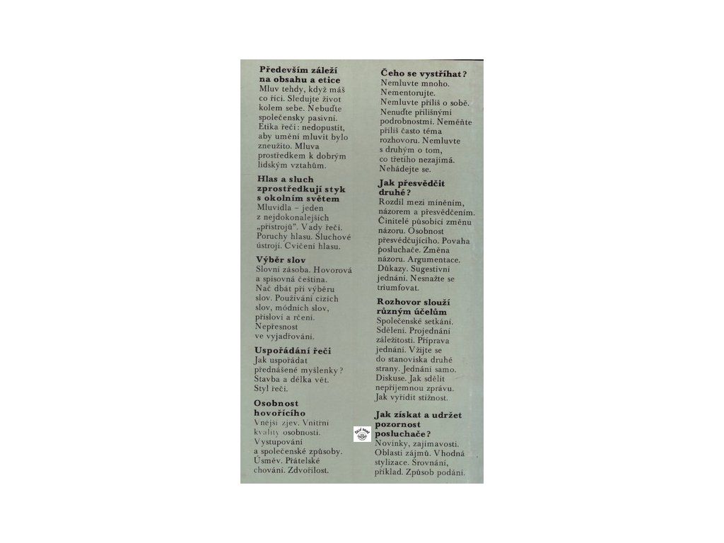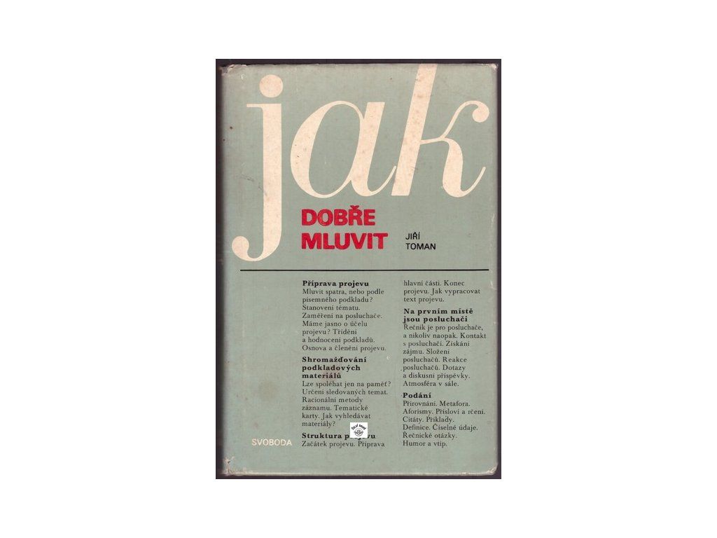 příprava a struktura projevu, podání, osobnost hovořícího, čeho se vystříhat,......, plátěná vazba s přebalem, ten, na pár místech lehce natržený, kniha běžný stav, 356 stranDoplňkové parametry